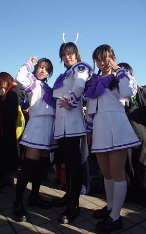 |  | 冬コミで撮ったものです。左からは舜ちゃん(慧)、 みかちゃん(冥夜)と私です。二人とも格好良い です! 2002年冬コミ2日目 |