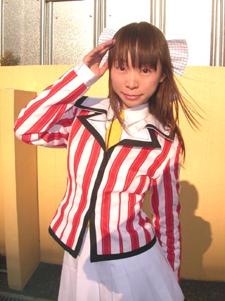 |  | ヒロインの希望ちゃんをやってみました。実は小町が 一番好きですが、髪の毛の長さが違いすぎで断念で した。希望ちゃんも好きですが…。 写真はGelさんに撮って頂いたものです。光の具合が 素敵ですvありがとうございました。 2002年11月4日ディファー |