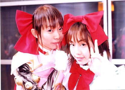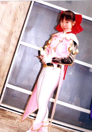 サクラ4の戦闘服です。ラリッサというPVCで作りました。 歩くとギシギシと言います。上半身が熱くて下半身が寒い 衣装です。 写真は内田さんから頂きましたものです。ありがとうございま した(^^)。 2002年9月のTGSです。 |